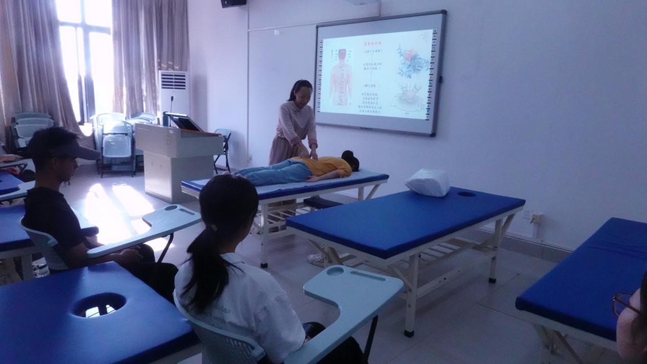 了解基础原理后,李老师亲身示范晃脊、揉脉、禅拍三种中医自然疗法的手法和实操流程,通过细致入微的讲解、手把手的演示,让同学们学习到基本的中医疗心方法。同学们两两为一组,其中一人实操时,另一人躺着体验,李老师到每个同学身边指导和示范,让同学们切身感受到中医自然疗法给身心带来的放松与舒缓。